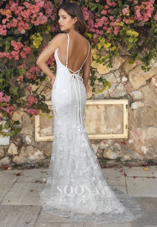 Deep V-Neck Spaghetti Straps Mermaid Boho Wedding Dress Floor-Length Lace Beach Dress with Appliques