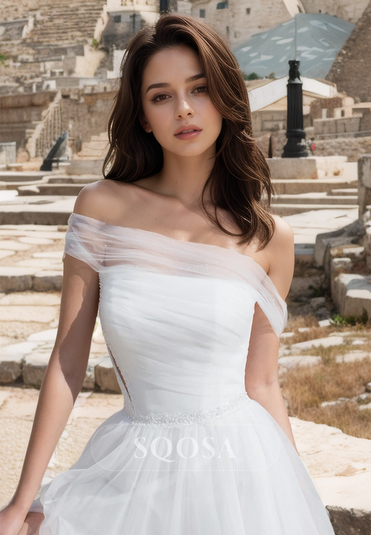 Off-Shoulder Sleeveless A-Line Boho Wedding Dress Floor-Length Beaded Pleated Satin Bridal Gowns