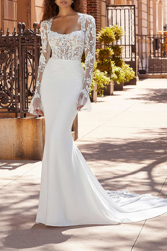 Mermaid Wedding Dress Square Neckline Long Sleeves Boho Wedding Gown QW2293