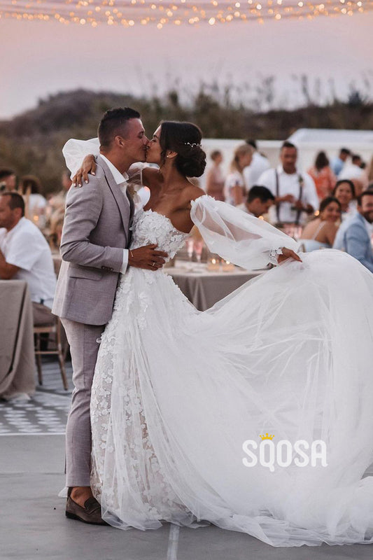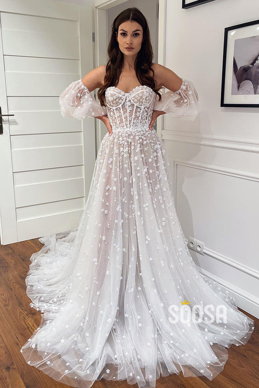 A Line Sweetheart Detachable Long Sleeves Romantic Wedding Dress QW2220