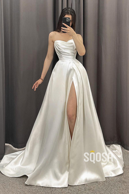 Sheath/Column Strapless Ivory Satin Simple Wedding Dress with Slit QW2176