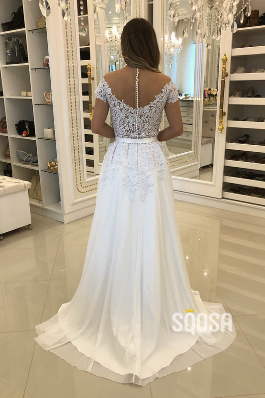 A Line Illusion V Neck Lace Appliques Boho Wedding Dress with Slit Bridal Gown QW2307