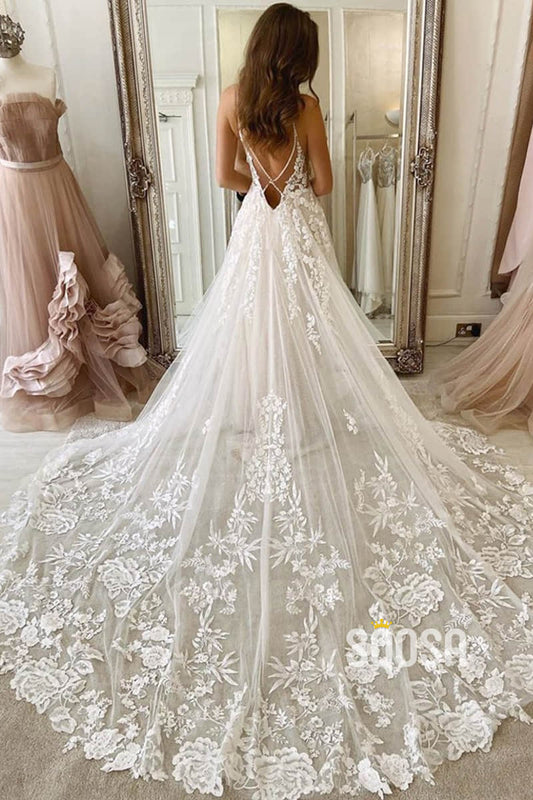 A-line Spaghetti Straps Lace Appliques Simple Wedding Dress QW2338