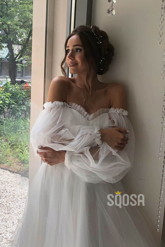 A-line Chic Off-the-Shoulder Long Sleeves Rustic Wedding Dress Bridal Gown QW2160