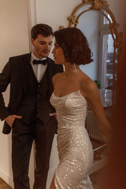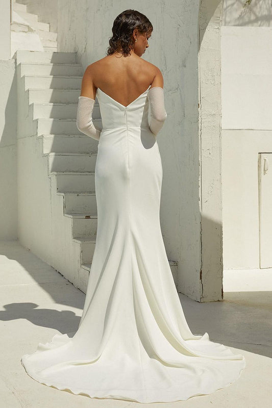 Sheath/Column Strapless Satin Pleats Elegant Boho Wedding Dress with Slit QW2538