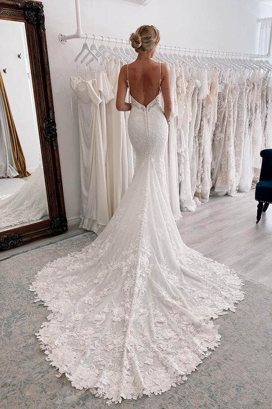 Spaghetti Straps Lace Appliques Mermaid Wedding Dress with Court Train QW2295