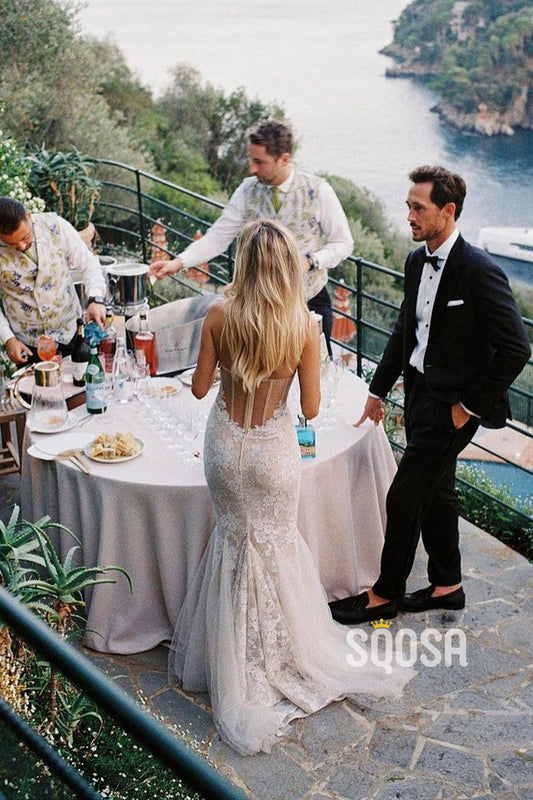 Illusion Scoop Lace Appliques Mermaid Wedding Dress QW2113
