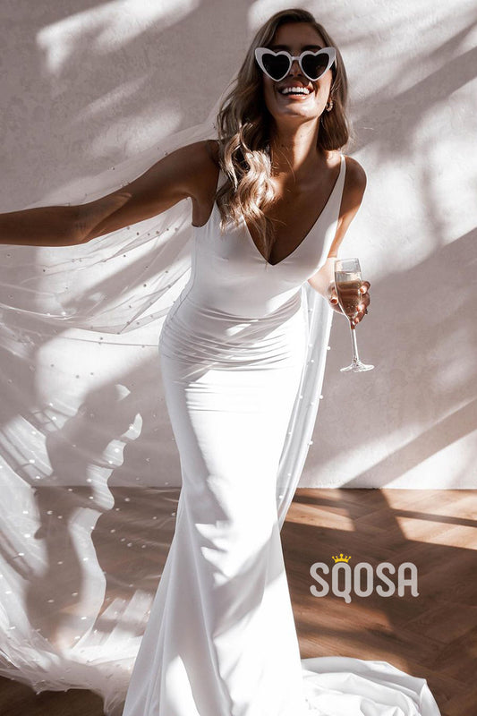 Sexy V neck Satin Pleats Simple Boho Mermaid Wedding Dress Backless QW2221