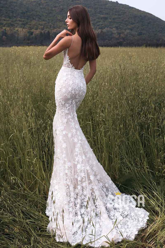 Plunging V -neck Spaghetti Straps Allover Lace Mermaid Wedding Dress QW2140