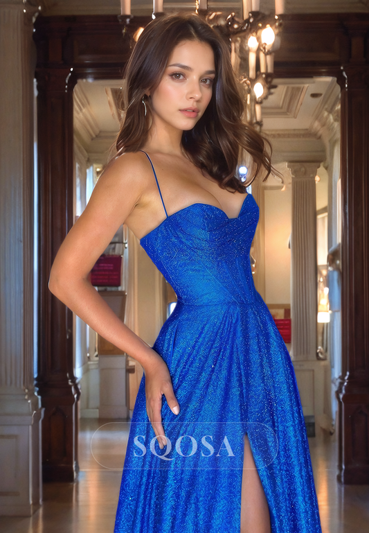 Prom Dress A-line Sweetheart Spaghetti Straps with High Slit Glitter-Knit Evening Dress