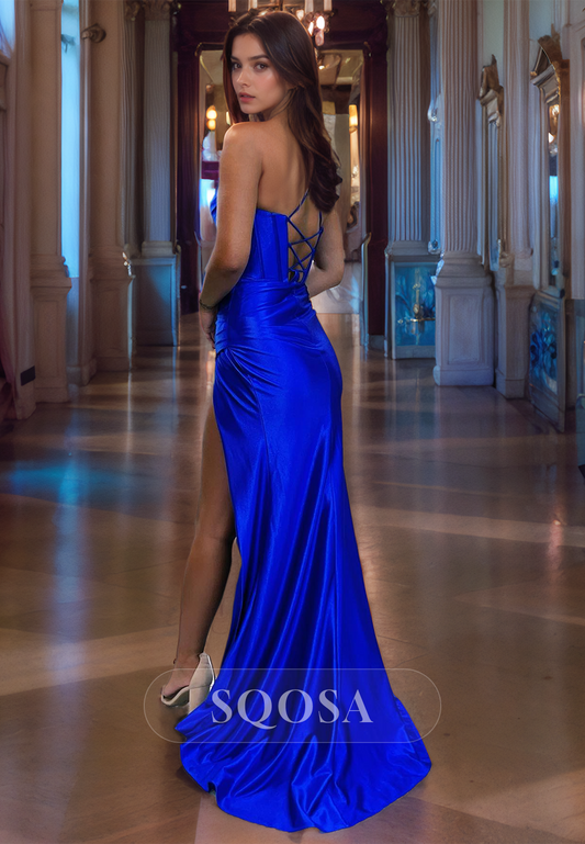 V-Neck Sleeveless Spaghetti Straps Sheath Train Prom Dress Slit Satin Formal Dress with Beaded