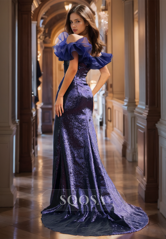 Ruffled Tube Top Sleeveless Mermaid Prom Dress Glitter-Knit High Slit with Sweep Train Party Dress