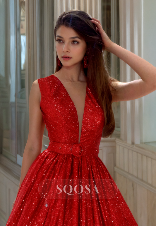 Deep V-Neck Sleeveless A-Line Formal Prom Dress Pleated Glitter-Knit Evening Gowns with Train