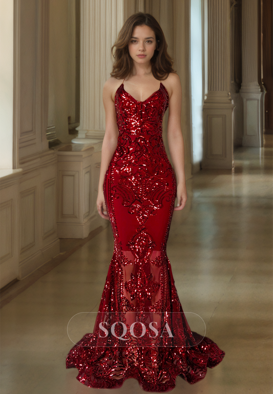 Allover Sequined Mermaid Prom Dress V-Neck Spaghetti Straps Sleeveless Evening Gowns with Train