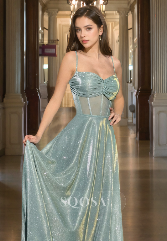 Spaghetti Straps Sweetheart Sleeveless Cutout Prom Dress Glitter-Knit Pleated A-Line Party Gowns