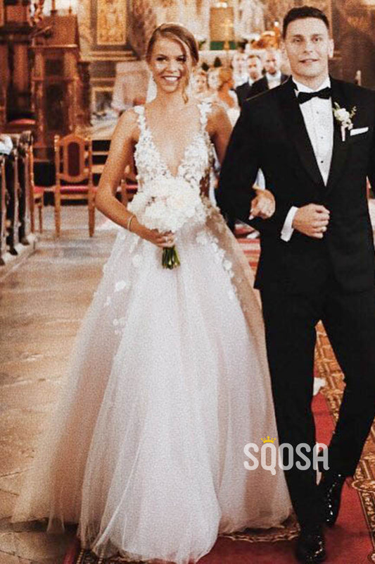 Attractive V-neck 3D Appliques A-line Wedding Dress QW2563