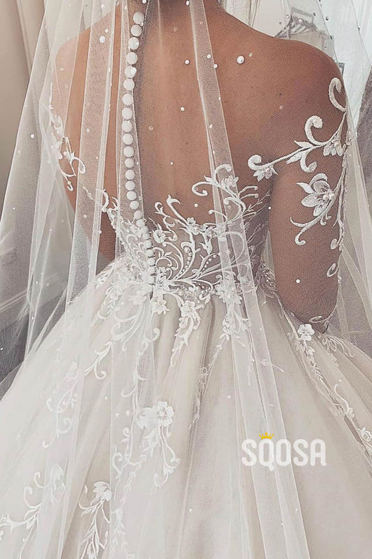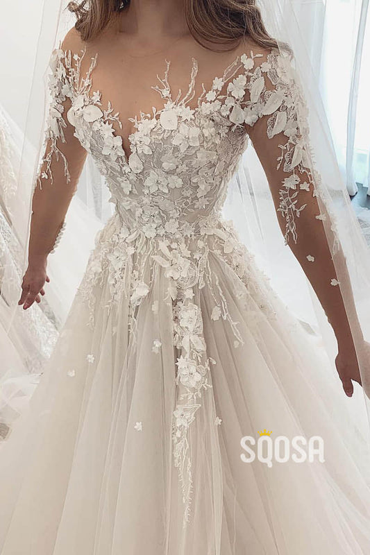 A Line Illusion Neckline Lace Long Sleeves Wedding Dress QW2643