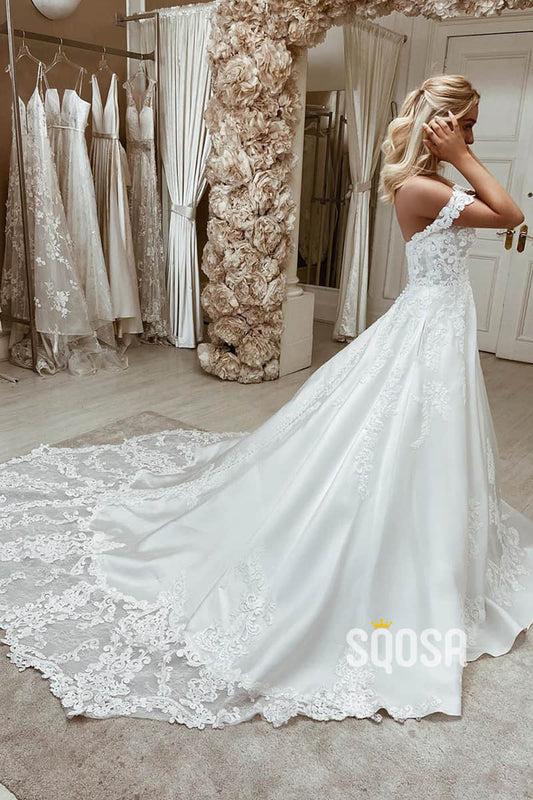 Unique Off-Shoulder Exquisite Lace Appliques A-line Wedding Dress with Court Train QW2557