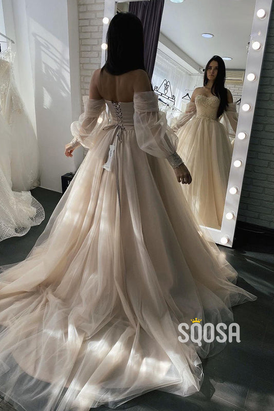 Off the Shoulder Tulle Appliques A-line Wedding Dress QW2665