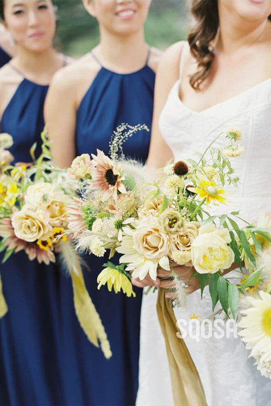 A-line Unique Halter Royal Blue Chiffon Long Bridesmaid Dress Floor Length QB2085