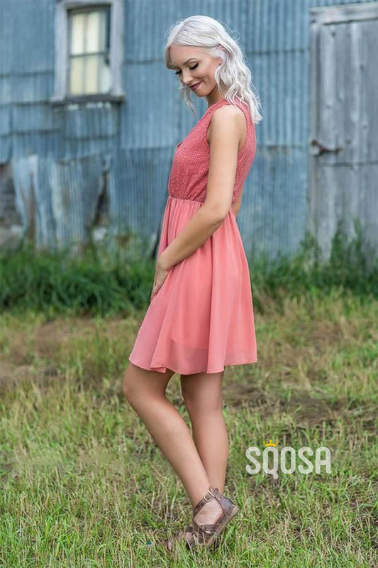 A-line V-neck Lace Top Coral Short Bridesmaid Dress QB2117