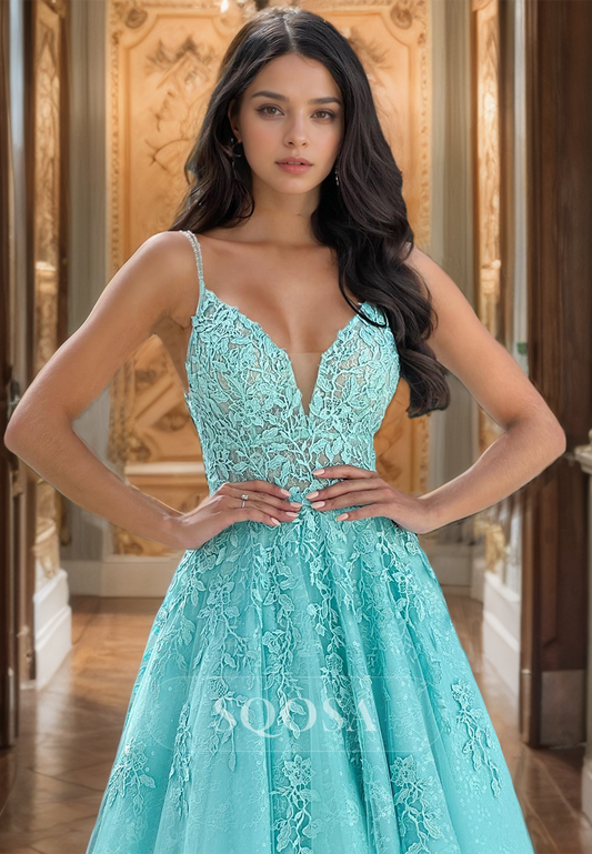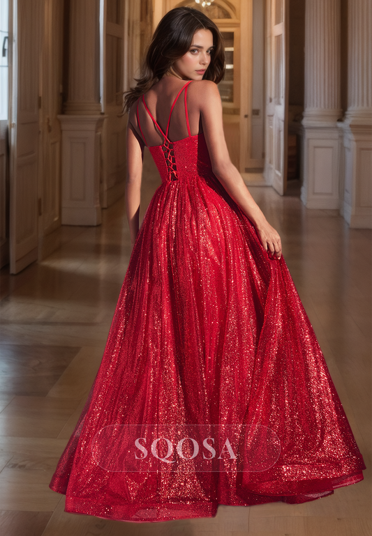 A-Line Sweetheart Spaghetti Straps Evening Party Dress Sleeveless Glitter Lace with Pleated Prom Dress