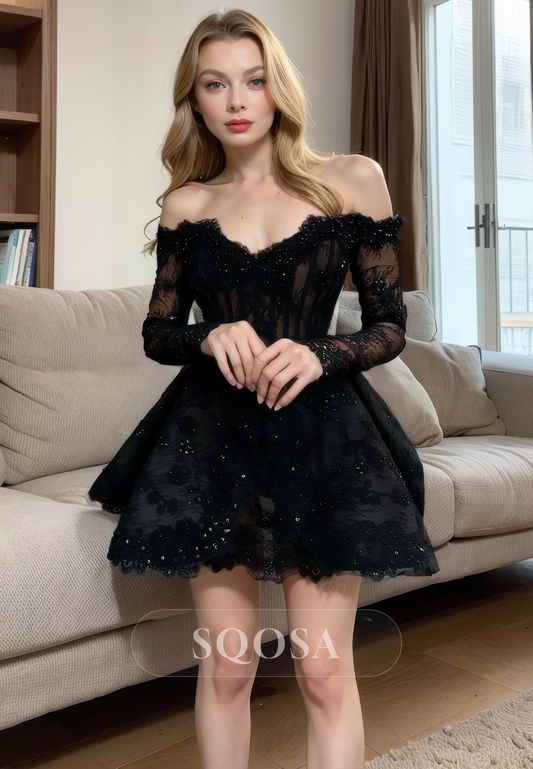 Off Shoulder Long Sleeves Lace Black Homecoming Dress Short Prom Dress