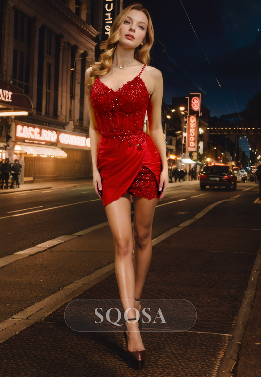 Spaghetti Spaghetti V Neck Appliques Short Homecoming Dress Tight Graduation Dress