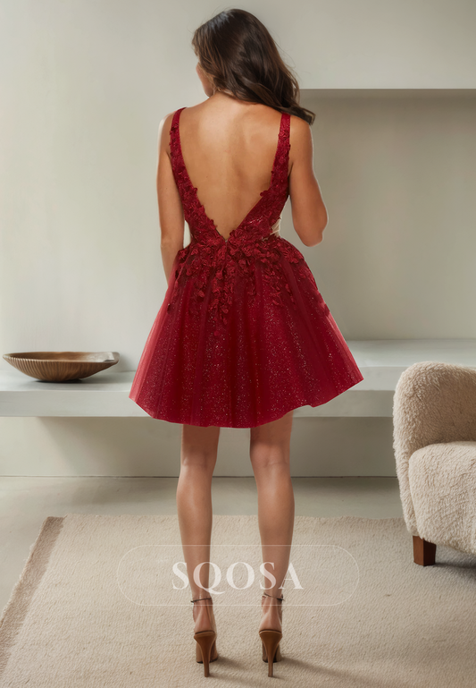 A Line V Neck Appliques Cute Homecoming Dress Short Graduation Dress Open Back