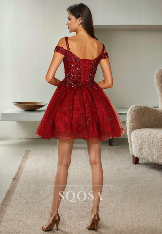 A Line Off Shoulder Sequins Appliques Short Homecoming Dress Black Graduation Dress