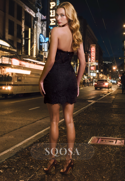 Sheath Sweetheart Lace Beads Black Homecoming Dress Short Graduation Dress