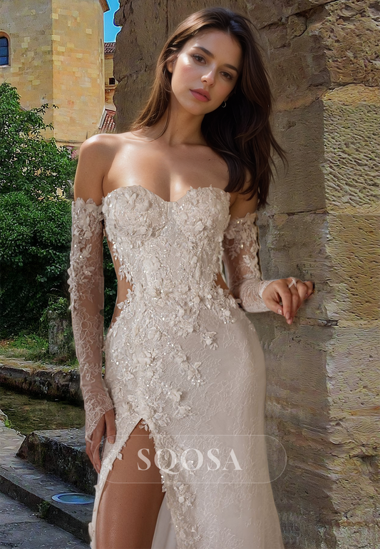 Sweetheart Long-Sleeves Off-Shoulder Mermaid Wedding Dress Allover Lace Sweep Train Bride Gowns