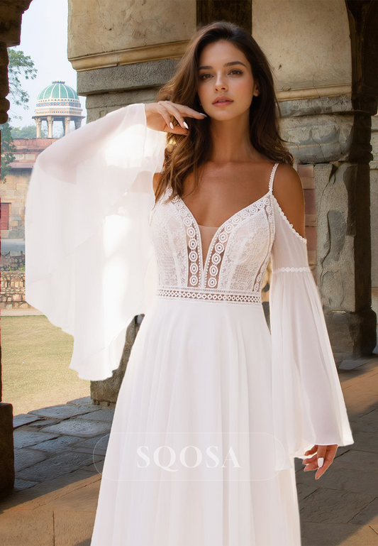 Spaghetti Straps Long-Sleeves Chiffon A-Line Wedding Dress Deep V-Neck Pleated Lace Applique Bride Gowns