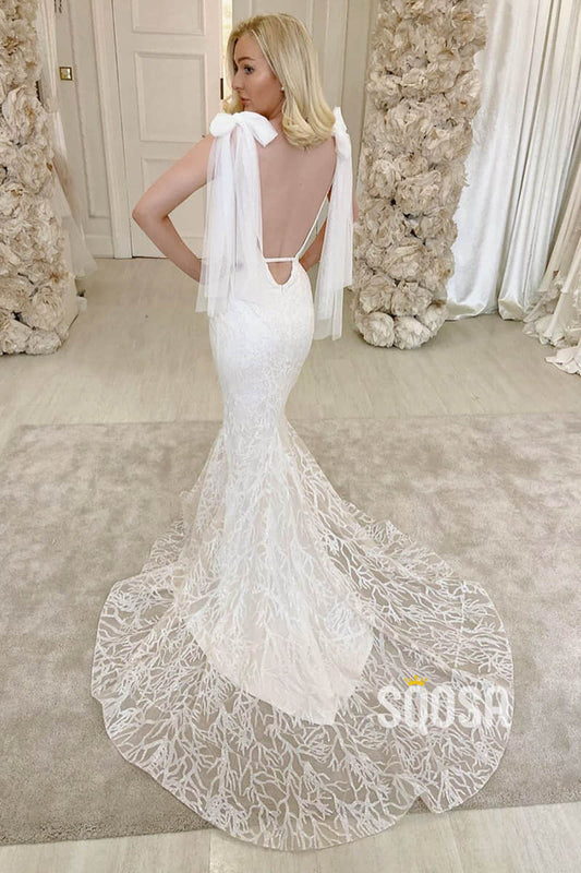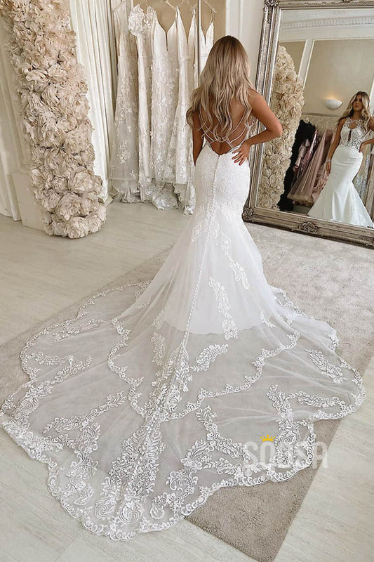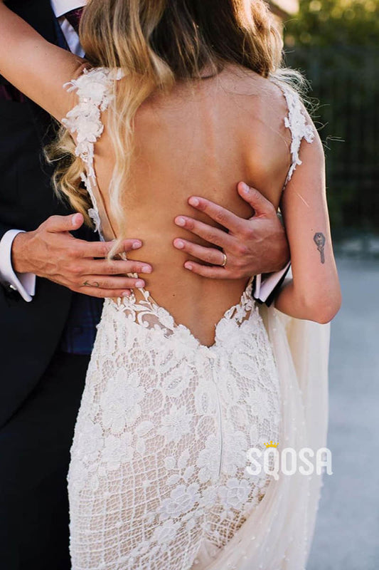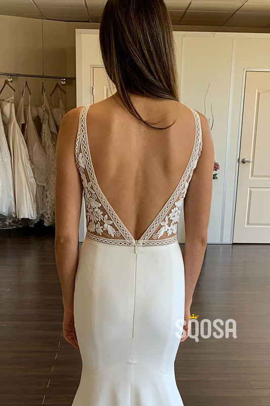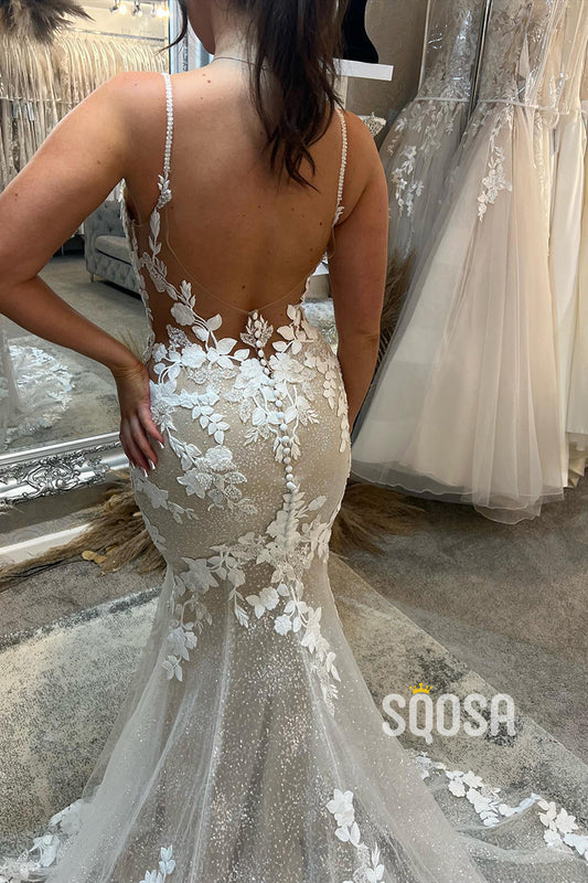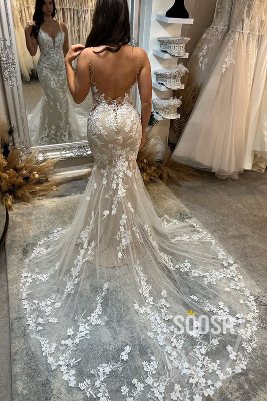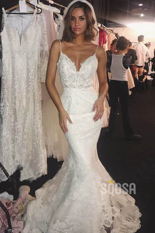 Chic Spaghetti Straps V-neck Lace Wedding Dress Backless Mermaid Wedding Gowns QW2092