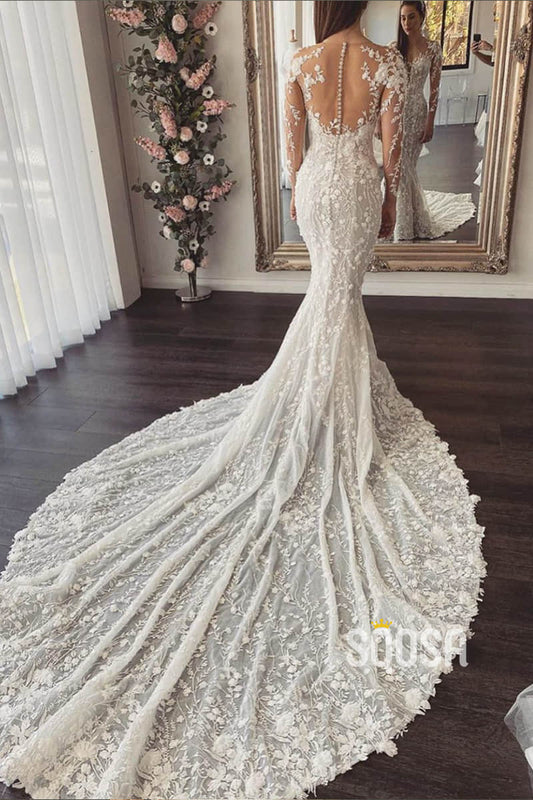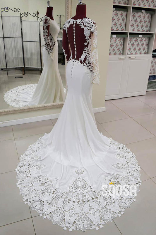 Mermaid Wedding Dress Illusion Long Sleeve Lace Wedding Dress with Watteau Train QW0885