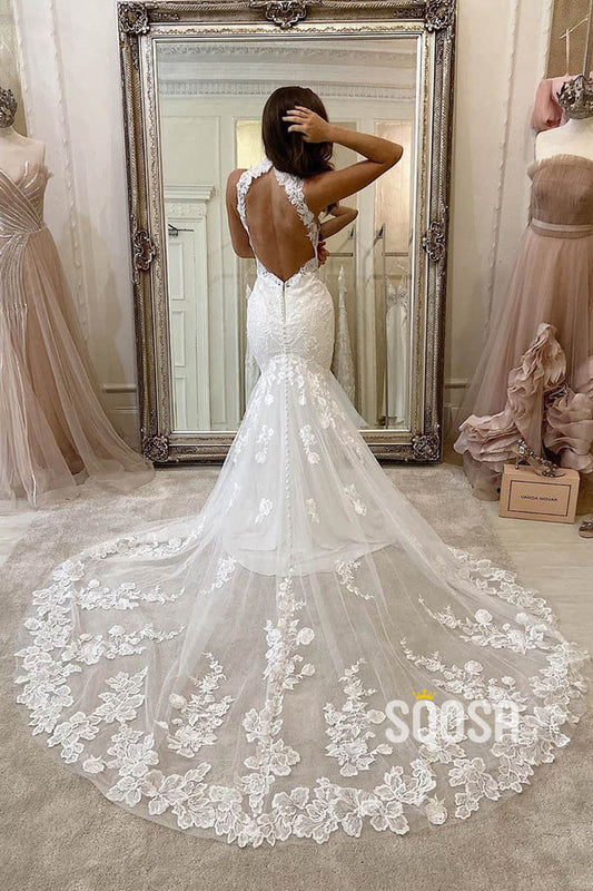 Mermaid Wedding Dress Chic High Neck Lace Wedding Gowns with Court Train QW0948