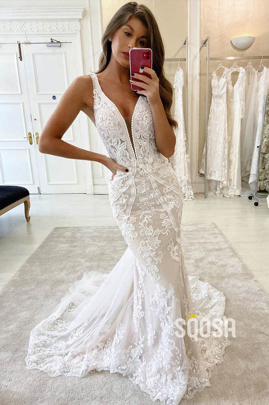 Mermaid Wedding Dress V-neck Lace Wedding Gowns QW0949