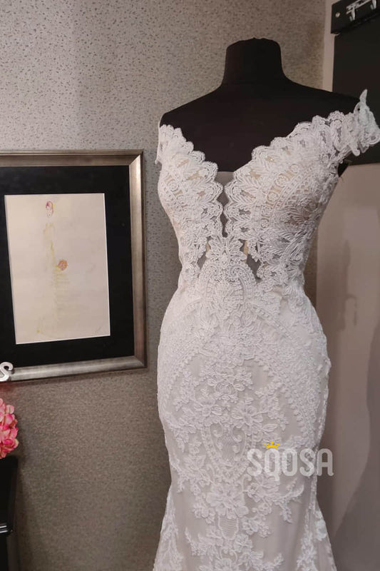 Illusion Cap Sleeves Mermaid Wedding Dress Lace Wedding Gowns QW0950