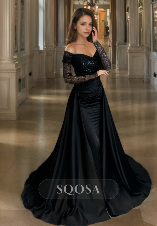 Sweetheart Long-Sleeves Pleated Mermaid Prom Dress Sequined Formal Gowns with Overskirt