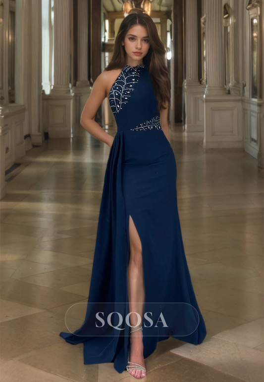 Halter Deep V-Neck Off-Shoulder Sleeveless Formal Gowns Beaded Applique Mermaid Prom Dress with Slit