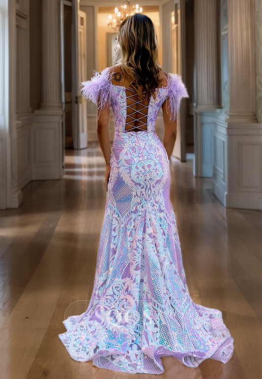 Sweetheart Sleeveless Glitter Lace Mermaid Dress Feathered Trimmed with Slit Prom Dress