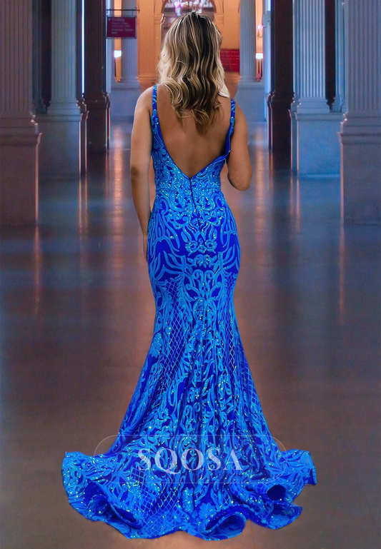 V-Neck Spaghetti Straps Mermaid Prom Dress Allover Sequined Slit with Train Party Gown