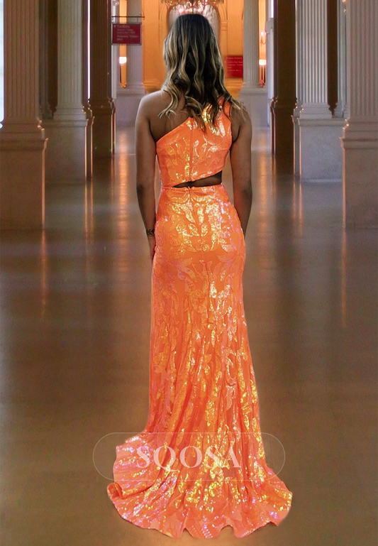 Asymmetrical Neck One-Shoulder Mermaid Prom Dress Allover Sequins Party Dress with Train