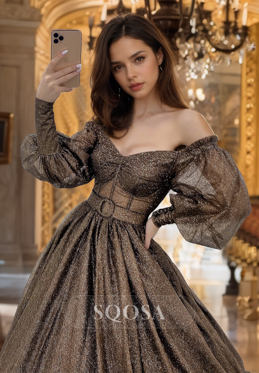 A-Line V-Neck Long-Sleeves Off-Shoulder Prom Dress Pleated Glitter-Knit Evening Gowns with Sweep Train