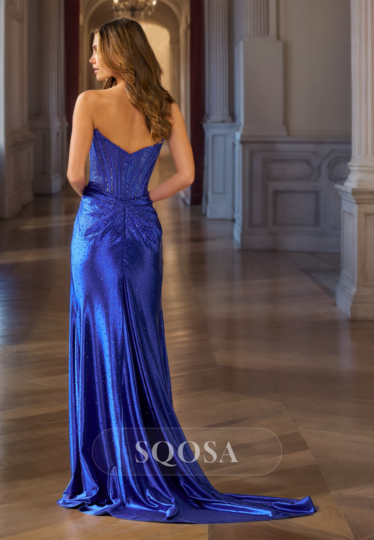 Sweetheart Off-Shoulder Sleeveless Mermaid Prom Dress Beaded Sequined Pleated Formal Gowns with Slit