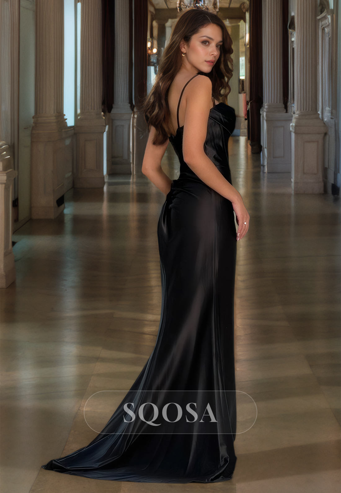 Sweetheart Spaghetti Straps Sleeveless Pleated Satin Slit with Sweep Train Formal Prom Dress