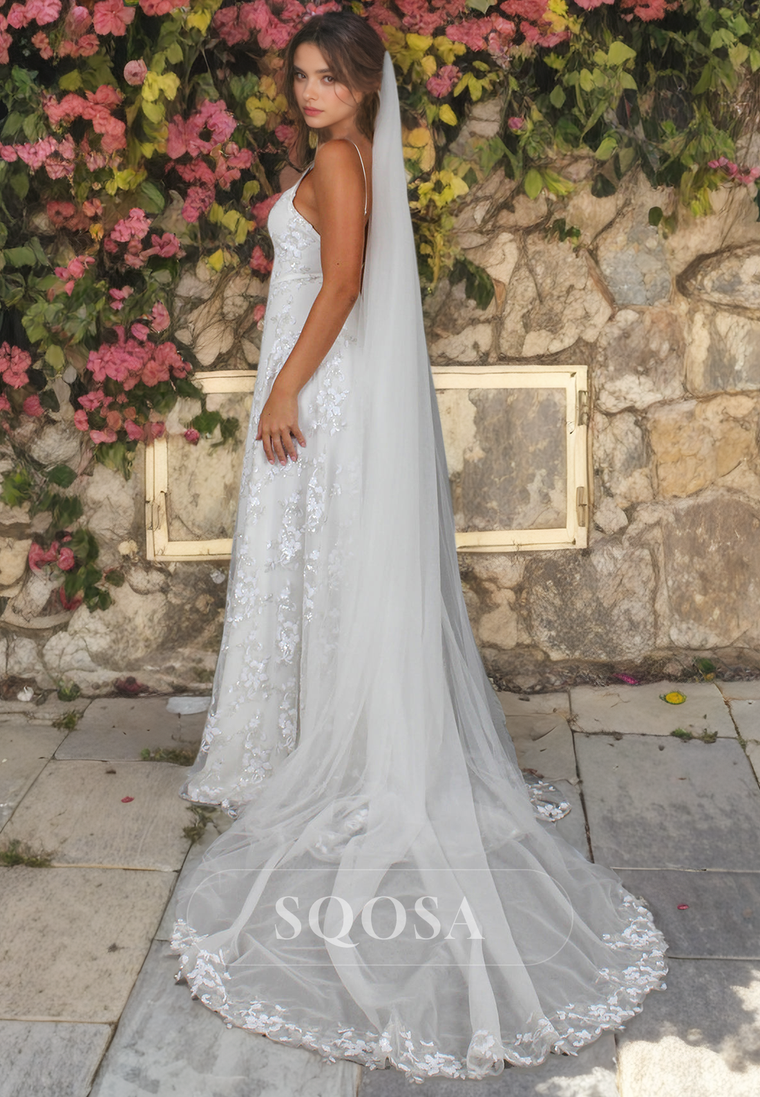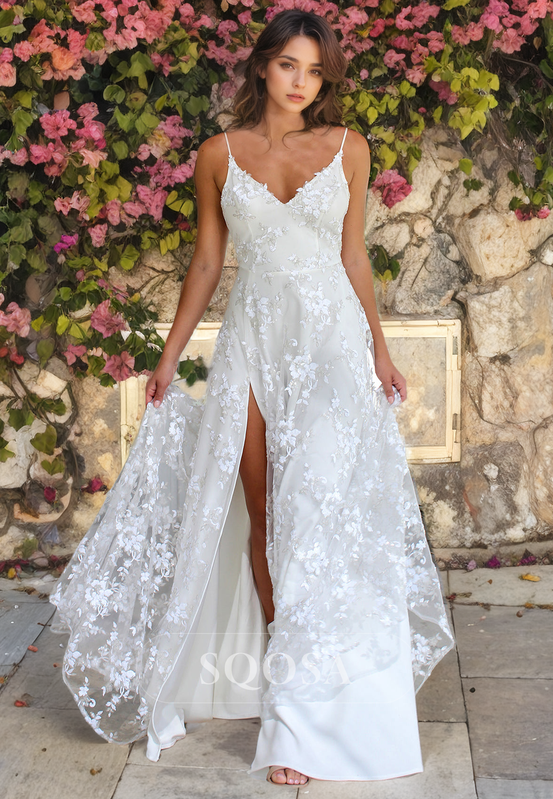 A-Line Allover Lace Beach Wedding Dress V-Neck Slit with Sweep Train Wedding Gowns