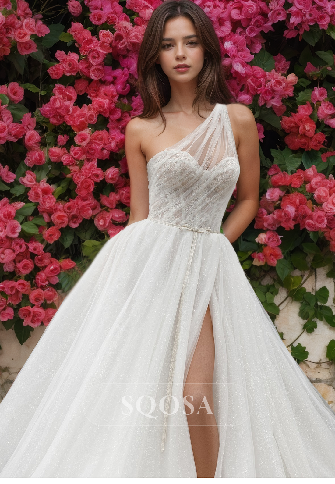 Sweetheart Sleeveless Off-Shoulder Pleated A-line Bride Dress Glitter-Knit High Slit Wedding Dress with Train