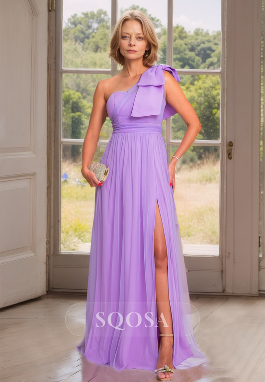 Asymmetrical-Neck Sleeveless A-Line Mother of the Bride Gpwns Pleatrd Slit with Train Coctail Dress