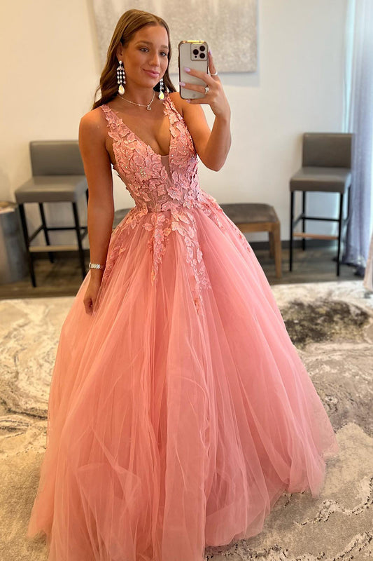 Attractive V-Neck 3D Appliques Pink Cute Prom Dress Long QP1199
